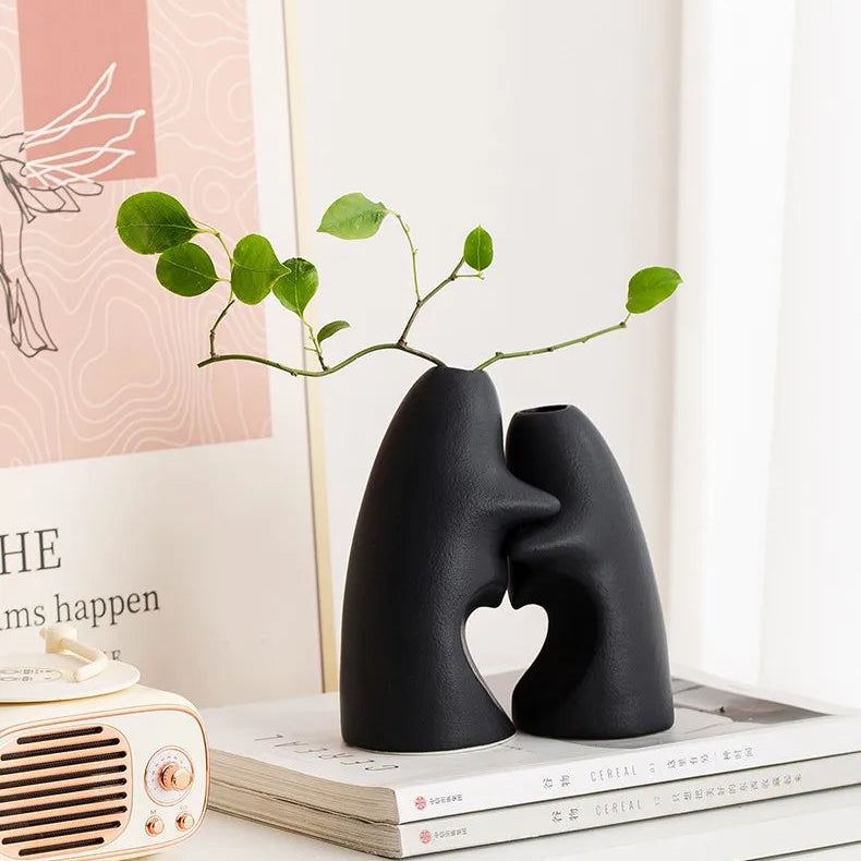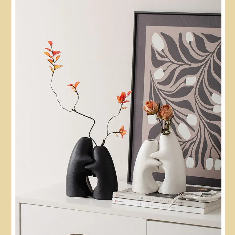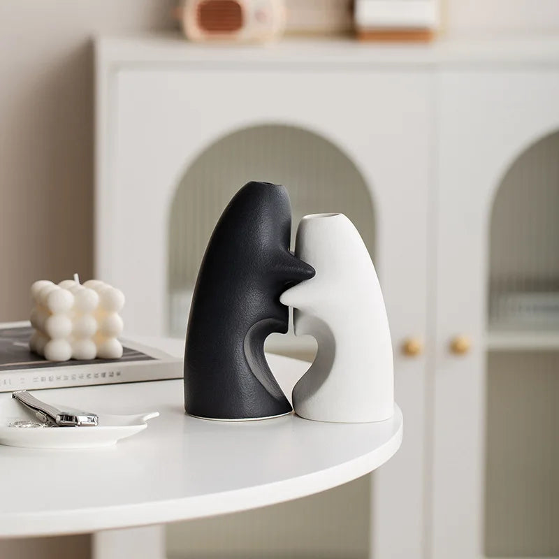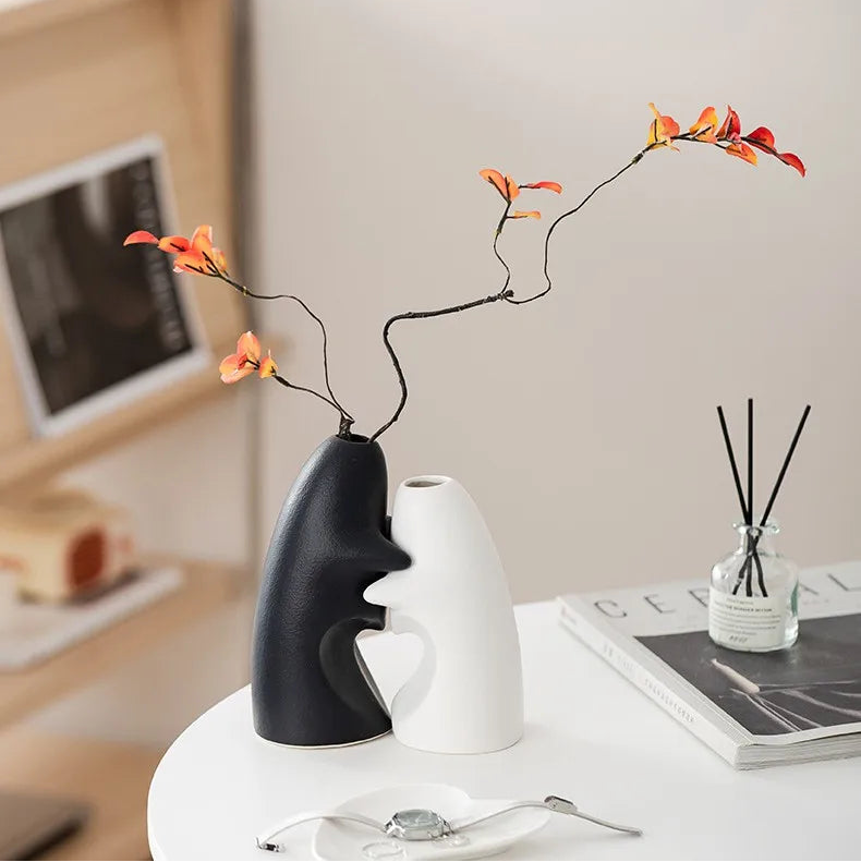 Celebrate love and connection with this Couple Hug Ceramic Vase Set, featuring two abstract vases in black and white that form a heart when placed together. Their creative hugging design symbolizes unity and balance, making them a romantic and artistic addition to any modern space.