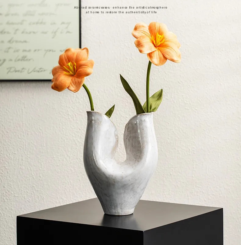 Elevate your interior design with this Double Mouth Ceramic Vase, a modern reinterpretation of Nordic retro aesthetics. Its sculptural form and clean lines make it a stunning centerpiece that effortlessly enhances any living room, dining table, or office space.