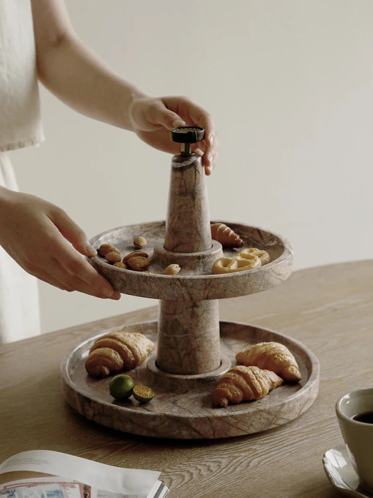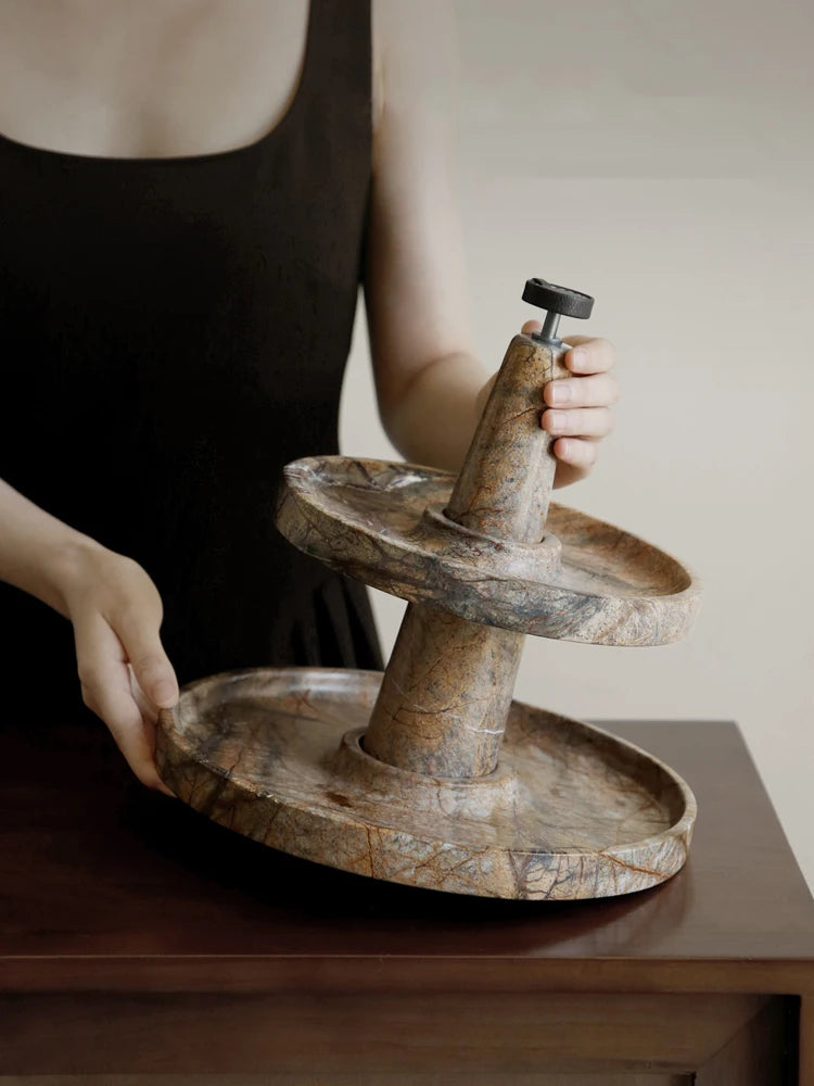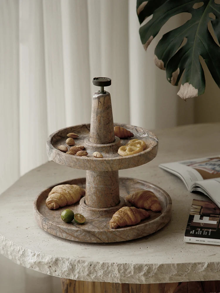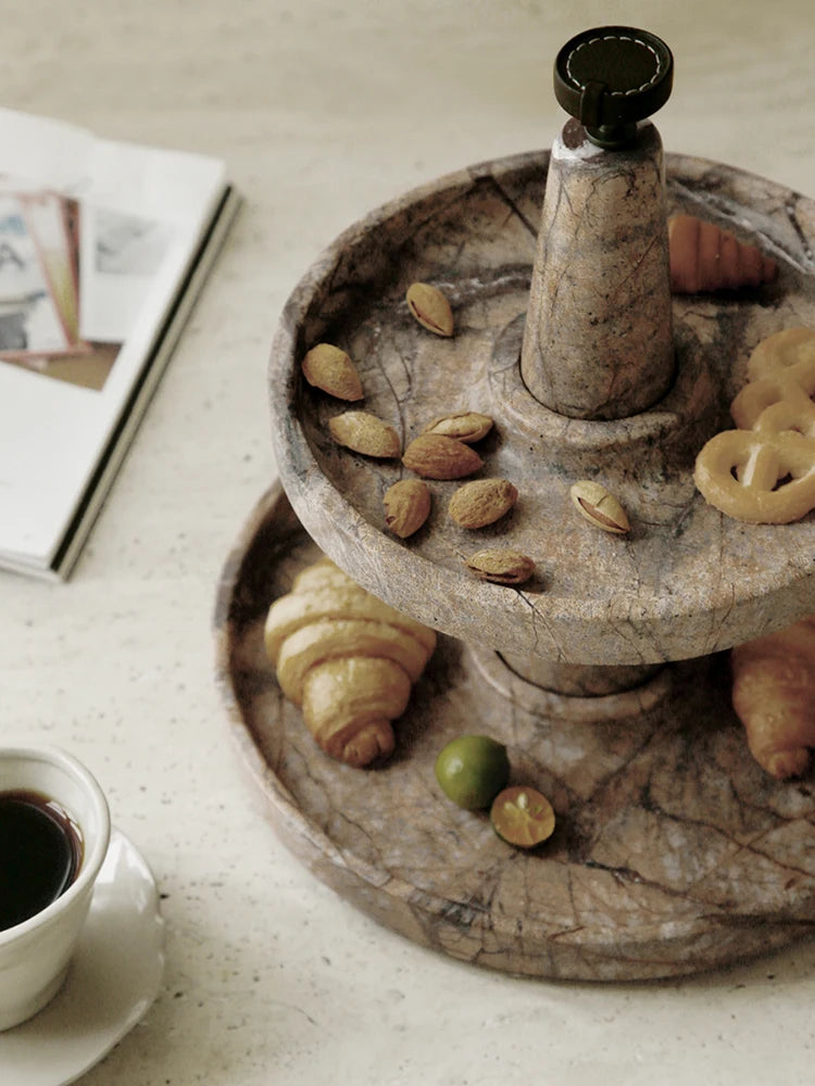 Elevate your table setting with this two-tier natural marble serving tray, designed to add timeless sophistication to any event. Its polished coffee-brown stone and refined silhouette bring a luxurious touch to kitchens, living rooms, or special celebrations.