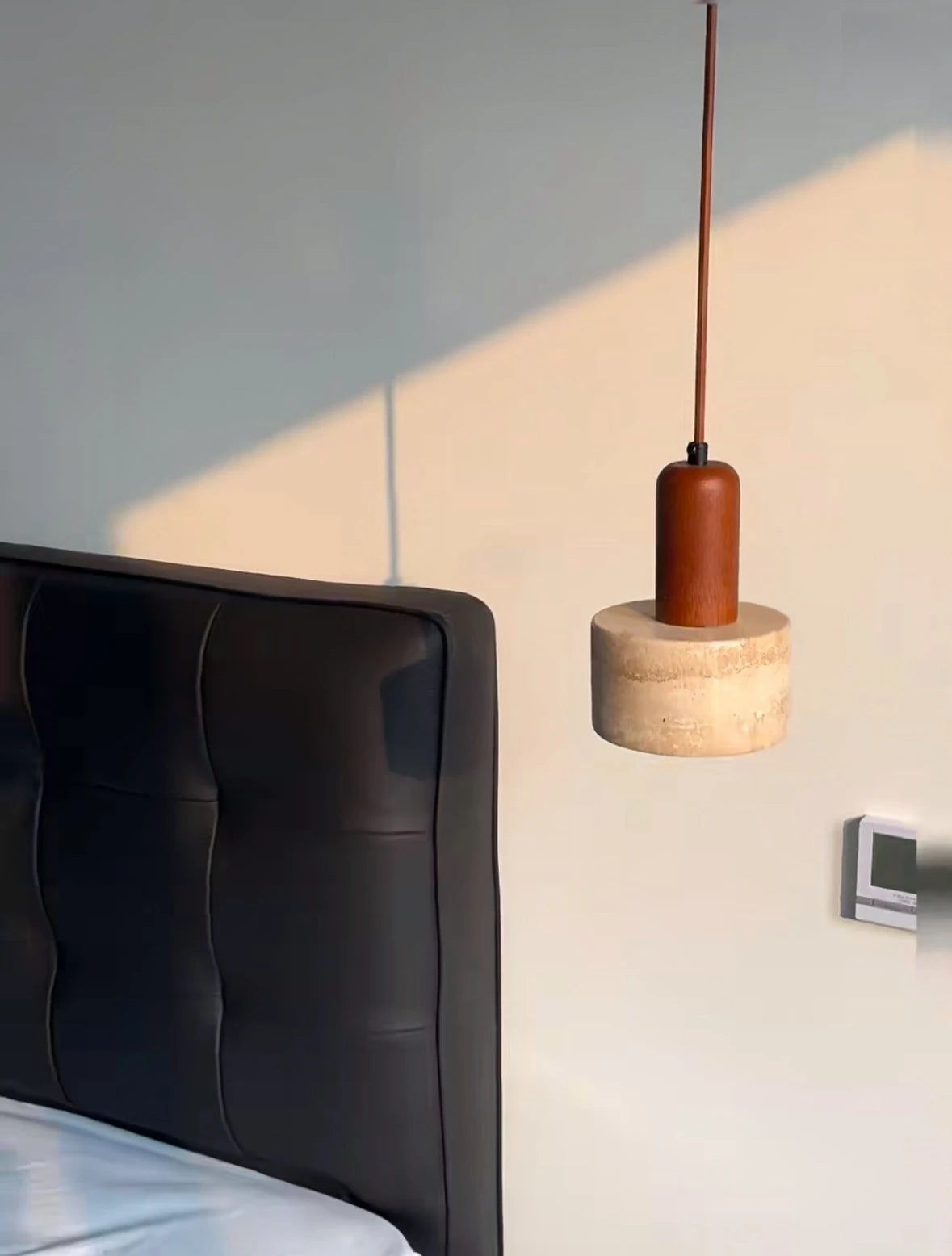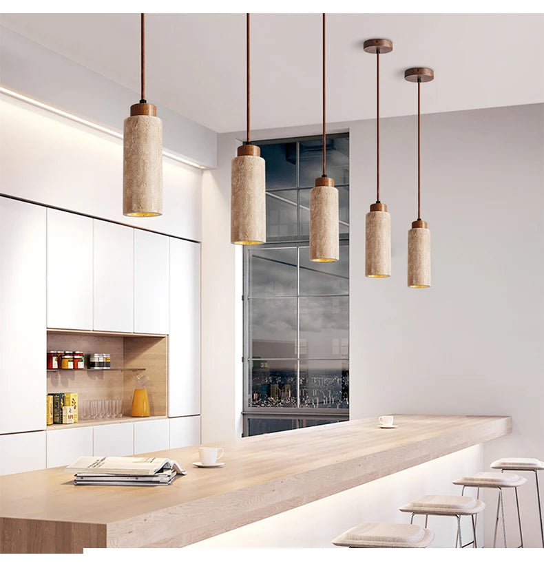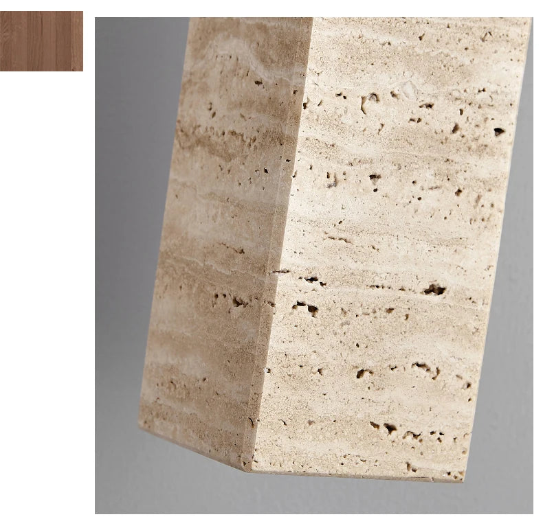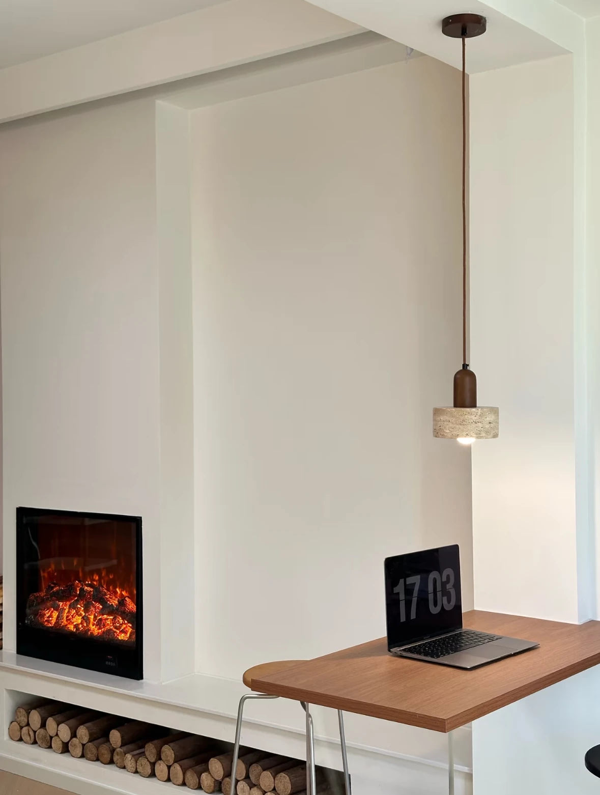 Designed with an adjustable three-color LED light and flicker-free technology, it balances ambiance with eye comfort. The combination of travertine and wood elements adds artisanal charm, making it a striking focal point for dining areas, kitchens, bedrooms, or living rooms.